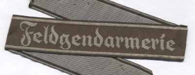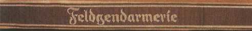 Der braune, 3 cm breite, Ärmelstreifen war gotischen, orange Buchstaben bestickt und zusammen mit dem Feldgendarmerie-Polizeiadler-Ärmelabzeichen am linken Unterarm getragen.