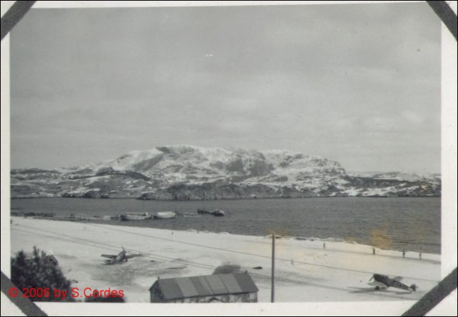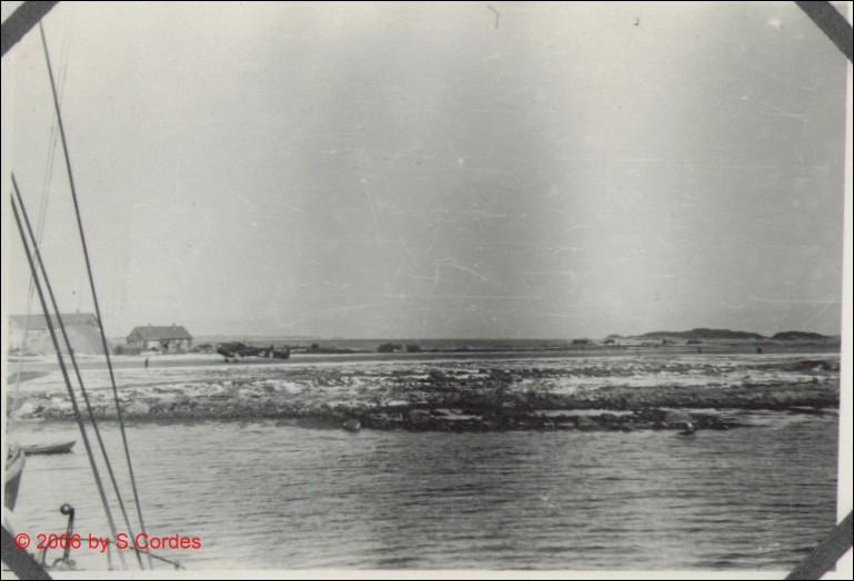 | Me 109 E (gelbe 2 & 5) der 3. Staffel des Jagdgeschwaders 5 | Überblick über den Platz. Im Hintergrund der Minensucher M1. |