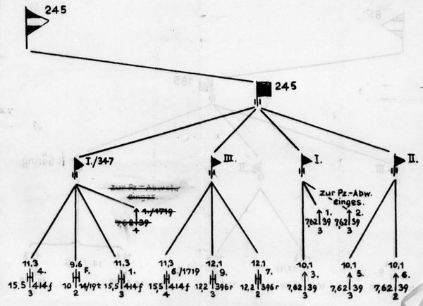 Feldpostnummern ab dem 1. Oktober 1943: Die Einheiten wurden als Teile vom Artillerie-Regiment 245 in der Feldpostübersicht eingetragen. Am 1. März 1944 wurde dann eine Fla-Kompanie beim Regiment eingetragen. Am 11. April 1944 wurde die Fla-Kompanie zur 11. Batterie vom Artillerie-Regiment 245 umbenannt. Am 31. Juli 1944 wurde der Eintrag der 11. Batterie zur Panzerjäger-Abteilung 245 umbenannt. Am 9. Dezember 1944 verschwand die 10. Batterie bei der III. Abteilung.