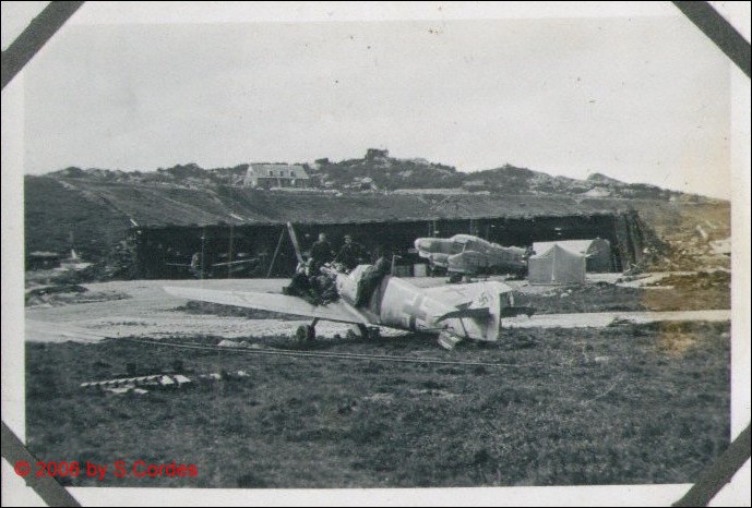 Me 109 E (gelbe 2 & 5) der 3. Staffel des Jagdgeschwaders 5 | Überblick über den Platz. Im Hintergrund der Minensucher M1. |