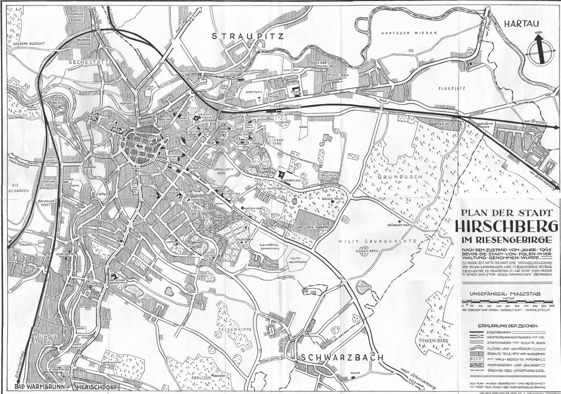 Die Stadt Hirschberg heißt heute Jelenia Góra und liegt im Westen Polens, rund 90 km südwestlich von Breslau. Seit dem 1. April 1922 bildete die Stadt Hirschberg einen eigenen Stadtkreis im Regierungsbezirk Liegnitz der preußischen Provinz Schlesien des Deutschen Reichs. 1924 wurde der Gutsbezirk Hartau, 1928 der Gutsbezirk Schwarzbach aus dem Landkreis in die Stadt eingegliedert. Am 9. Juli 1927 erhielt die Stadt Hirschberg, die bisher auch den Zusatz i. Schlesien trug, die neue Bezeichnung Hirschberg im Riesengebirge, wobei sich bald die amtliche Schreibweise Hirschberg i. Rsgb. durchsetzte. Die Stadt war Garnisonsstadt des Infanterie-Regiments 7, dessen Stab und das II. Bataillon in der Stadt lagen. Außerdem waren in Hirschberg eine Sanitätsstaffel, ein Ausbildungsleiter, ein Wehrbezirkskommando, ein Wehrmeldeamt, eine Heeresfachschule und weitere Einrichtungen der Reichswehr / Wehrmacht unter gebracht. Im Oktober 1937 wurde in der Arras-Kaserne die III. / Artillerie-Regiment 28 aufgestellt. Im Herbst 1938 wurde das Infanterie-Regiment 83 mit Stab sowie II. und III. Bataillon in Hirschberg aufgestellt. Nach Beginn des Zweiten Weltkrieges und dem Auszug der aktiven Truppenteile wurden in der Stadt mehrere Ersatztruppenteile unter gebracht bzw. aufgestellt. Die Luftwaffe betrieb 2 km östlich der Stadt einen Notlandeplatz, der zur Segelflugschulung genutzt wurde. Im März und April 1945 lag kurzzeitig der Panzer-Aufklärungs-Schwarm 5 auf dem Platz. Im Zweiten Weltkrieg wurde in Hirschberg ein Außenlager des KZ Groß-Rosen errichtet und von Februar bis Mai 1945 wurden Gefangene des Nacht-und-Nebel-Erlasses im Landgerichtsgefängnis Hirschberg inhaftiert. Gegen Kriegsende wurde der Notlandeplatz noch von der Luftwaffe genutzt und entsprechend durch Luftwaffen-Versorgungseinheiten belegt. Im April 1945 wurde die Stadt von der Roten Armee eingenommen und wenig später von der sowjetischen Besatzungsmacht zusammen mit fast ganz Schlesien unter polnische Verwaltung gestellt. Es begann die Zuwanderung polnischer Migranten, die zum Teil aus ostpolnischen Gebieten östlich der Curzon-Linie kamen. Der Stadtname wurde als Jelenia Góra ins Polnische übersetzt. Die deutsche Bevölkerung wurde bis auf wenige Ausnahmen vertrieben und enteignet. Die Stadt hatte keine Kriegszerstörungen erlitten, gleichwohl wurden zahlreiche Häuser der Altstadt nach 1945 dem Verfall preisgegeben.