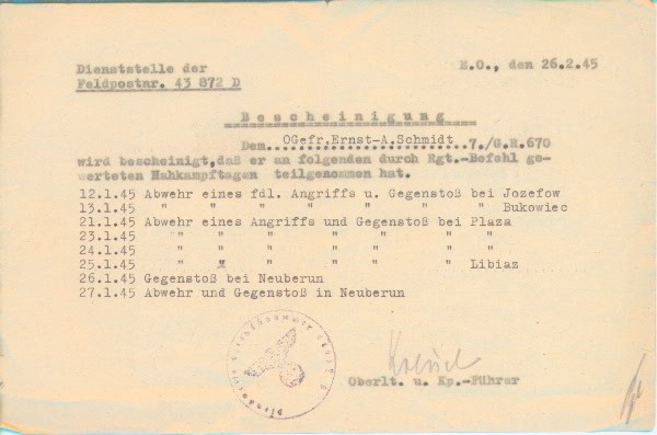 Bescheinigung für die Anrechnung von Nahkampftagen.