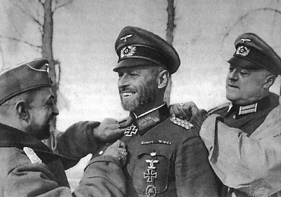 Generalmajor Scherer bekommt von Angehörigen seines Stabes das Ritterkreuz umgehängt. Scherer bekam es am 22. Februar 1942 für das erfolgreiche halten des Kessels von Cholm. Am 6. Mai 1942 wurde ihm als 92. Soldaten der Wehrmacht das Eichenlaub von Hitler verliehen. |