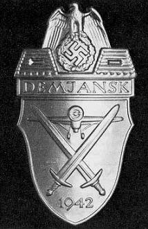 Artikel 3 (1) Der Demjanskschild wird verliehen als Kampfabzeichen an alle Wehrmachtangehörigen und der Wehrmacht unterstellten Personen, die in dem eingeschlossenen Raum von Demjansk an dem Verteidigungskampf ehrenvoll beteiligt waren. (2) Die Verleihung vollzieht in meinem Namen der Verteidiger von Demjansk, General der Infanterie Brockdorff-Ahlefeldt.