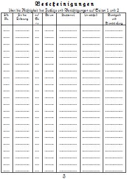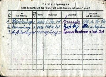 (Von links nach rechts) Lfd. Nr. Nummer der Änderung Art der Änderung z.B. "Beförderung" oder "Versetzung" auf Seite Hier wurde(n) die Seite(n) angegeben, die die Änderung betrifft. Datum Datum an dem die Änderung gemacht wurde. Truppenteil Truppenteil oder Feldpostnummer der Einheit, der der Soldbuchbesitzer angehört. Unterschrift Unterschrift eines Offiziers Dienstgrad und Dienststellung Dienstgrad und Dienststellung des Offiziers |